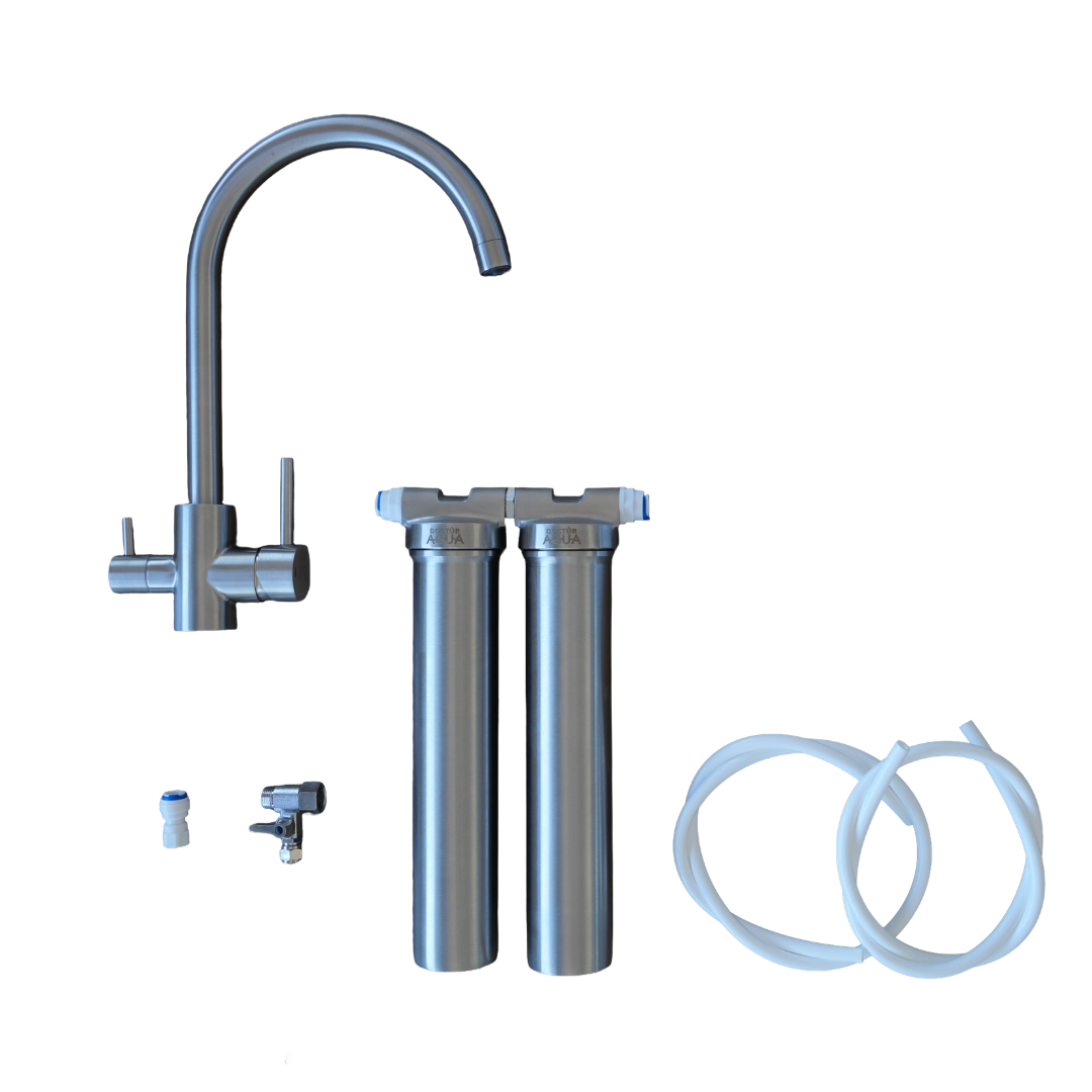 Sistema de filtración bajo encimera con doble etapa. Proporciona agua más segura, limpia y adaptada a la calidad del agua de tu zona.